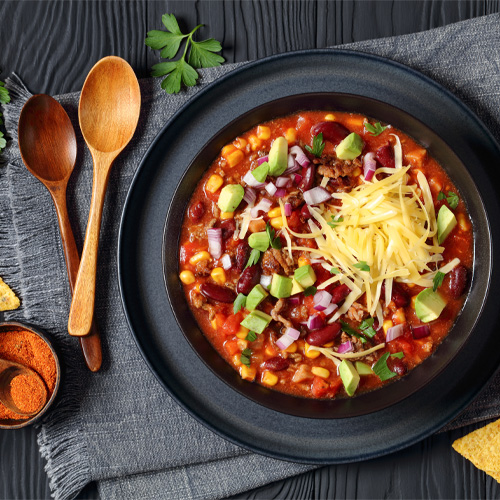Toppings: shredded cheese, tortilla chips, pickled jalapenos, chopped green onions, sliced black olives, pico de gallo, diced avocado, chopped cilantro